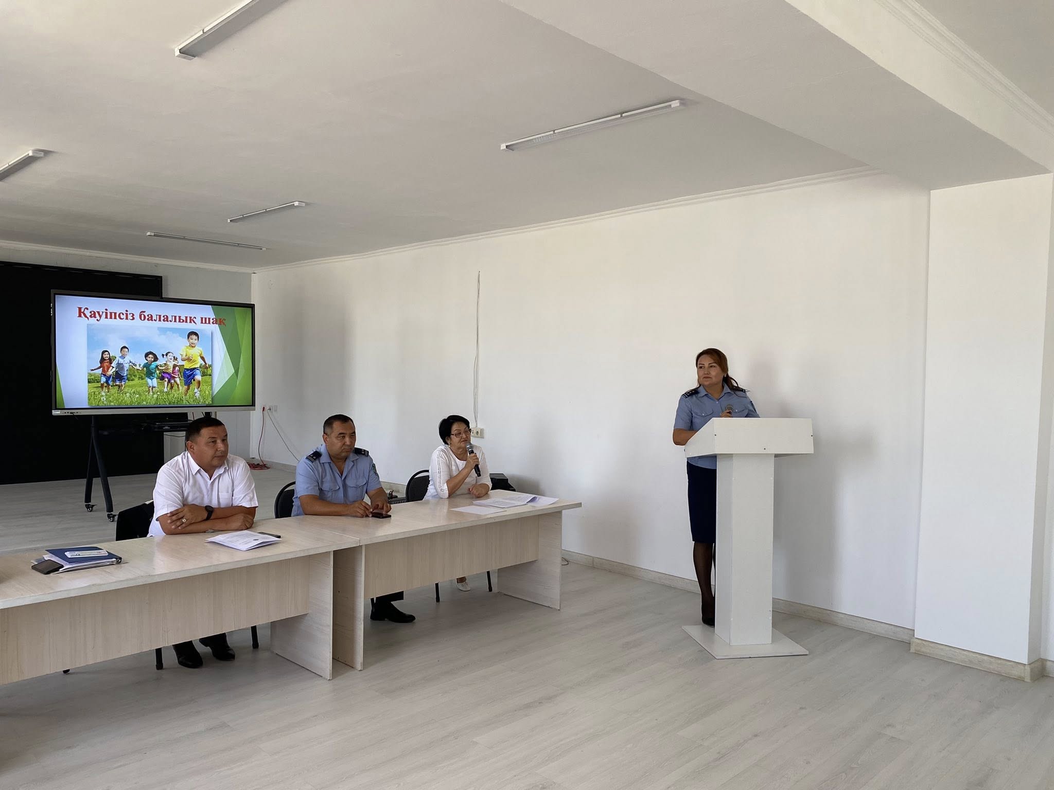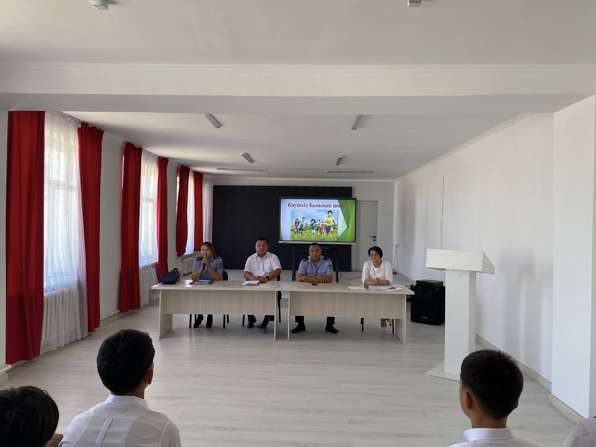 Ш.Қалдаяқов атындағы мектеп-гимназиясында 08.09.2025 жылы сағат 10:30-да 8-11сынып оқушылары арасында Отырар ауданының прокуратурасының 2025 жылғы 02.09 күнгі -2-12-25-00811 санды хатына сәйкес “Қауіпсіз балалық шақ” жобасы аясында жиналыс өткізілді.Жиналысқа аудан прокуратурасының мамандары,АІІБ-нің қызметкерлері ,жасөспірімдер полициясының аға инспекторы,подполковник Талғат Меңлібаев,мектеп инспекторы,полиция капитаны Ерденова Динара,аудандық білім бөлімінің тәрбие саласының әдіскері Алимжан Баирбеков,мектеп-гимназия директорының тәрбие ісі жөніндегі орынбасарлары,ұйымдастырушы педагог,мектеп тәлімгері,психологтар мен сынып жетекшілері қатысты.