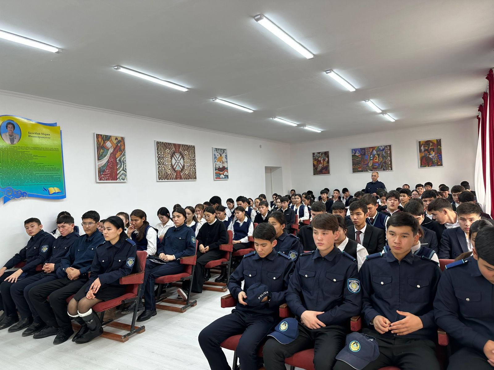 Күн тәртібіндегі бірінші мәселе бойынша Отырар АПБ кадр жөніндегі орынбасары полиция подполковнигі: Нұрбеков Асхат сөз алып кәмелетке толмағандар арасындағы және оларға қатысты жасалатын қылмыстардың алдын алу мақсатында күнделікті профилактикалық жұмыстар жүргізіліп отыратындығын таеыстырды.Оқушыларға «Нашақорлық, буллингтің алдын-алу,лудомания, құқық бұзушылықтың алдын-алу , зорлық -зомбылықтың алдын -алу»тақырыбында Кәмелеттік жасқа толмағандар арасындағы жасалатын қылмыстардың алдын- алу мақсатында рейдтік профилактикалық іс-шаралардың жүргізіліп жатқандығы айтылды.Күнделікті жүргізіліп жатқан рейд барысында, басқа кездерде де ешқандай құқықбұзушылыққа жол берілмейтіндігі айтылды.Мектеп оқушыларының себепсіз 10 күннен артық сабақтан қалған жағдайда, құмар ойындар ойнаған жағдайда,темекі өнімдерін сатып алып тұтынса оқушы есепке алынып ата-анасына айыппұл салынатындығы түсіндірілді.Жолда жүру ережелері,түнгі беймезгіл уақытта сенімді өкілінсіз көшеде жүрмеу мен балалардың жеке қауіпсіздіктері мен құқықтары жан-жақты таныстырлған жиын болды.Сондай-ақ жиын барысында оқушылар мен кері байланыс орнатылып,полиция мамандығын таңдау үшін не істеу керек деген сұрақтарға жауап берілді.