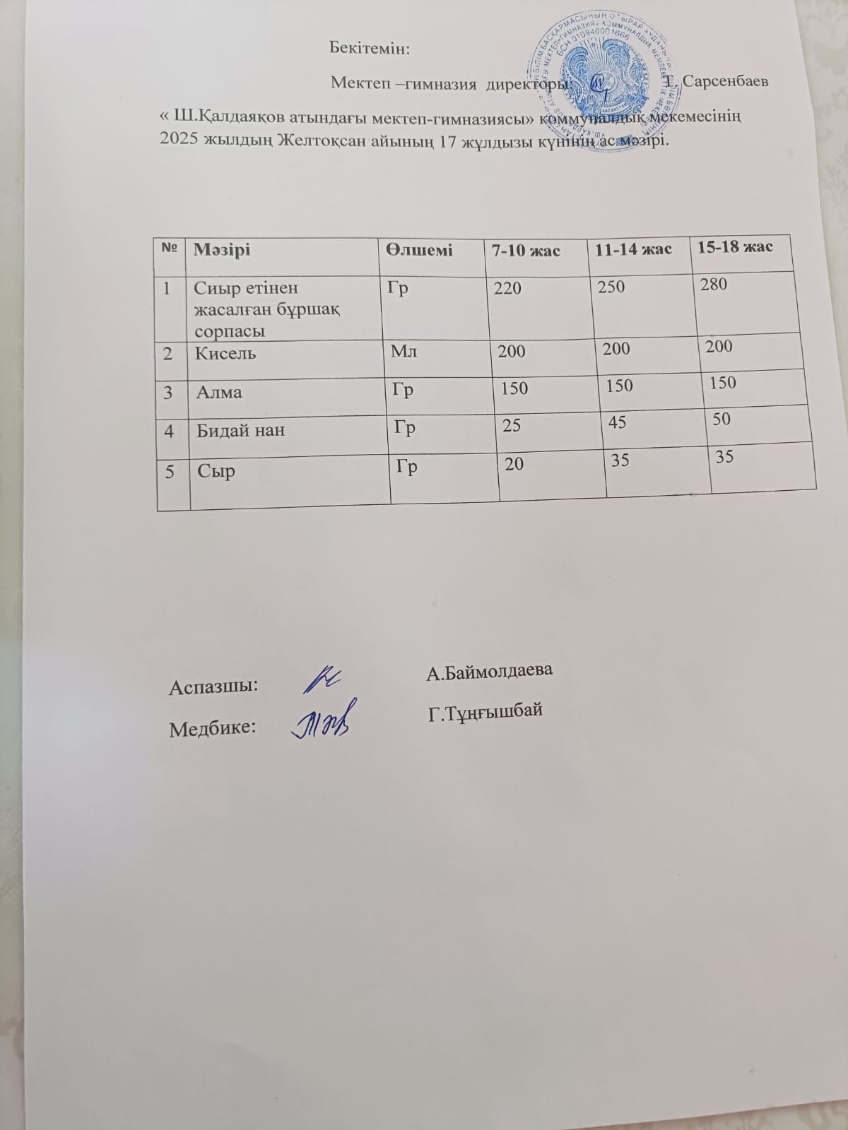 Ш.Қалдаяқов атындағы мектеп-гимназия 17.12.2025 ж Бүгінгі ас мәзірі