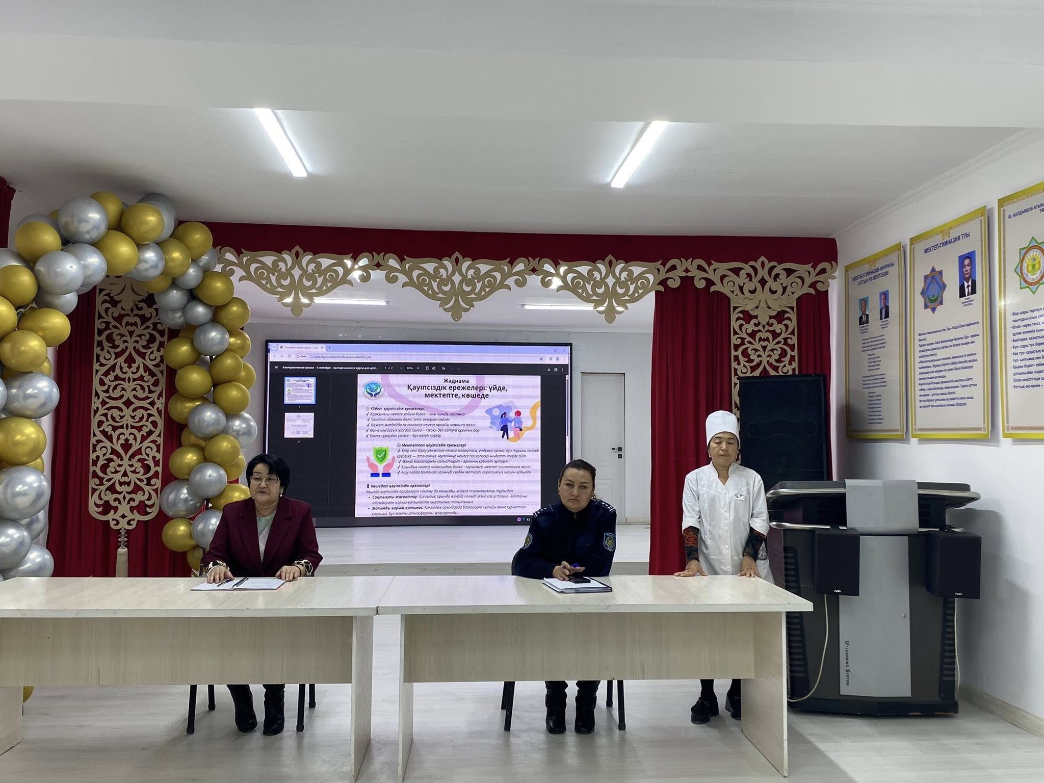 Мектеп инспекторы Д.Ерденова “Құқықбұзушылықтың алдын-алу және болдырмау” мақсатында түсіндіру жұмыстарын жүргізіп,қыздарға түнгі беймезгіл уақытта көшеде жүрмеуі,үйде және көшеде жүру қауіпсіздік ережелерінің жадынамасы таныстырылды.
