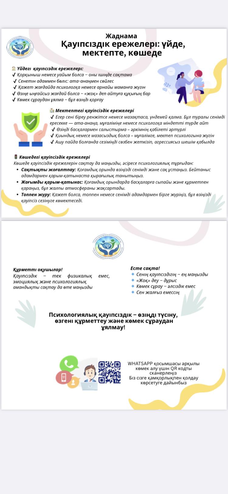 Мектеп -гимназия директорының тәрбие ісі жөніндегі орынбасары А.Алтынбекова оқушыларға мектепішілік тәртіп ережелері мен мінез-құлық әдептерін сақтауды таныстырды.Үйде және көшеде жүру қауіпсіздік ережелері туралы жадынама таныстырылып,өзіңді және өзгені құрметту,психологиялық көмек сұраудан тартынбау туралы түсіндірілді.