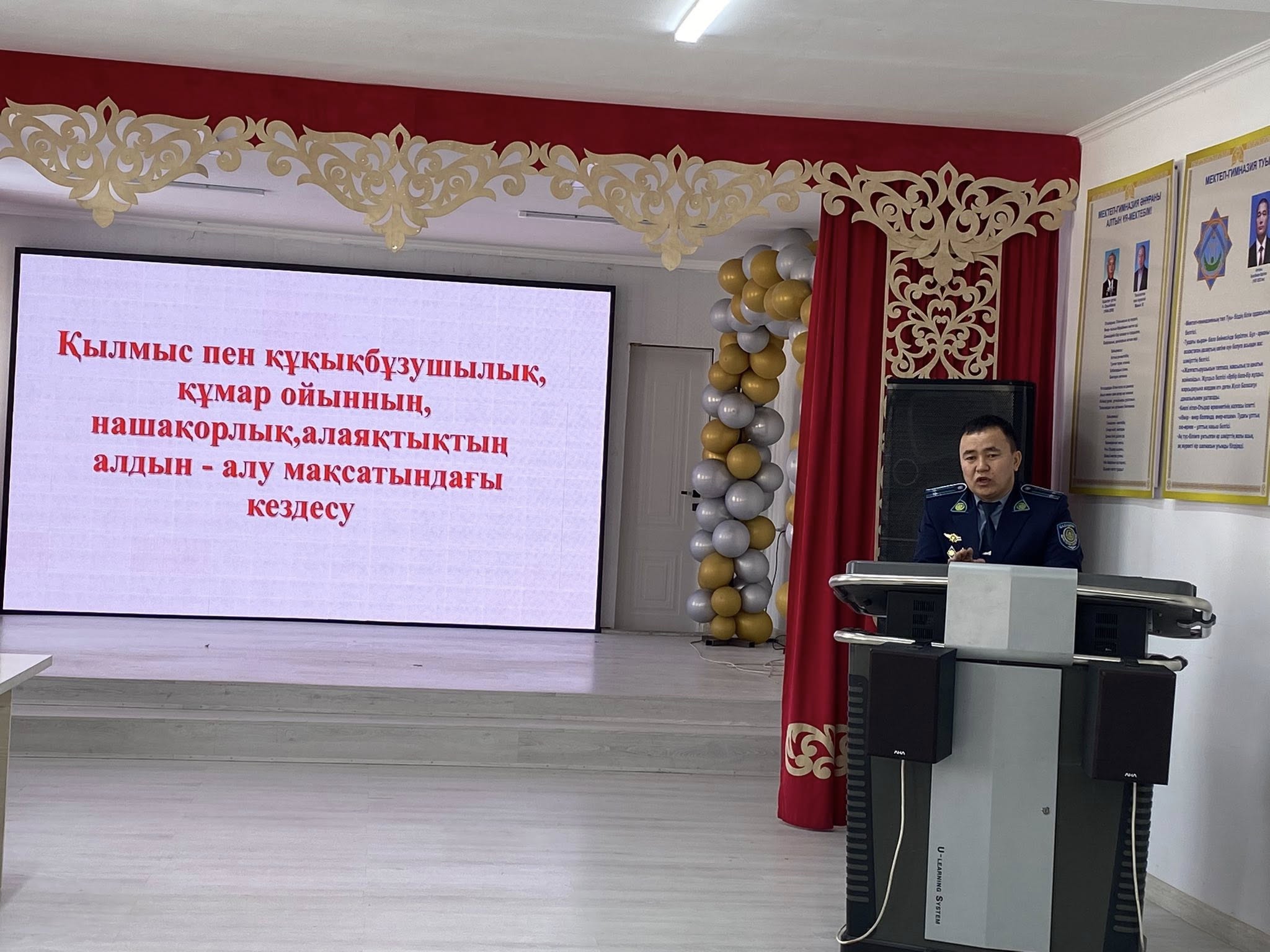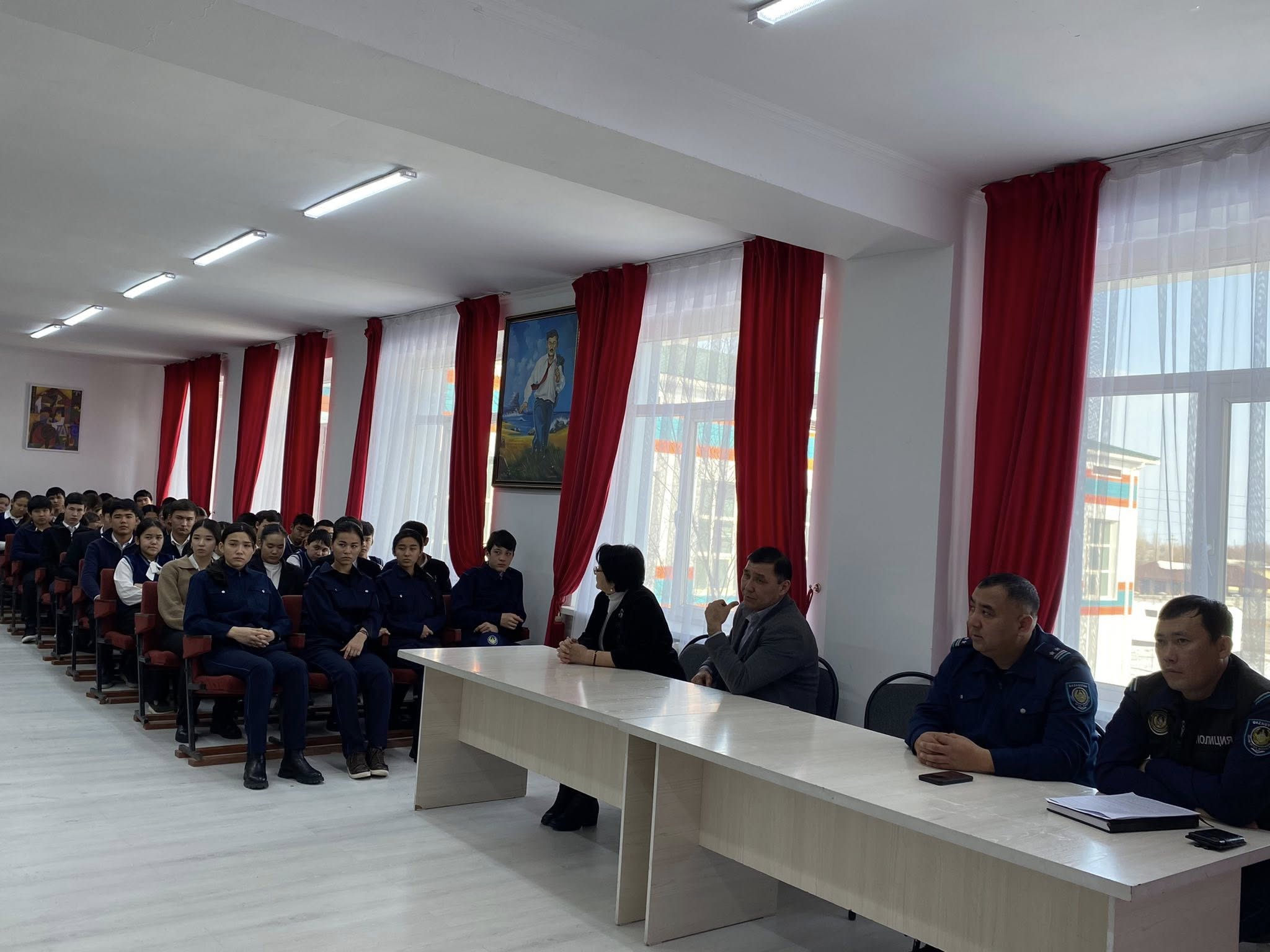 Ш.Қалдаяқов атындағы мектеп-гимназиясында 8-11сынып оқушылары арасында “Адал азамат “біртұтас тәрбие бағдарламасының аясында “Заң және тәртіп” құндылықтары аясында “Құқықбұзушылықтың,қылмысың,лудоманияның,нашақорлық пен аутодеструктивті мінез -құлықтың алдын-алу мақсатында мүдделі органдар, аудандық полиция бөлімінің қызметкерлерімен бірлескен жиналыс өткізілді
